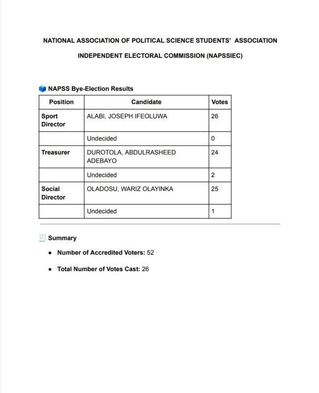 What continues to spark conversation, however, is the low level of engagement. This election revealed a troubling pattern of persistent voter apathy and declining political engagement within NAPSS. Out of 200+ eligible voters, only 52 were accredited, and only 26 casted their vote.
