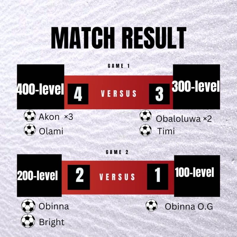 400-Level vs. 300-Level was a Seven-Goal Thriller, the clash between the 400-level and 300-level teams lived up to its billing as a must-watch match, with the seniors edging out their juniors 4-3 in a thrilling encounter. The 400-level team wasted no time asserting their dominance, racing to a 2-1 lead at halftime. Akon proved unplayable in the first half, netting two goals, while Oba kept the 300-level team in contention with a fine strike of his own.
