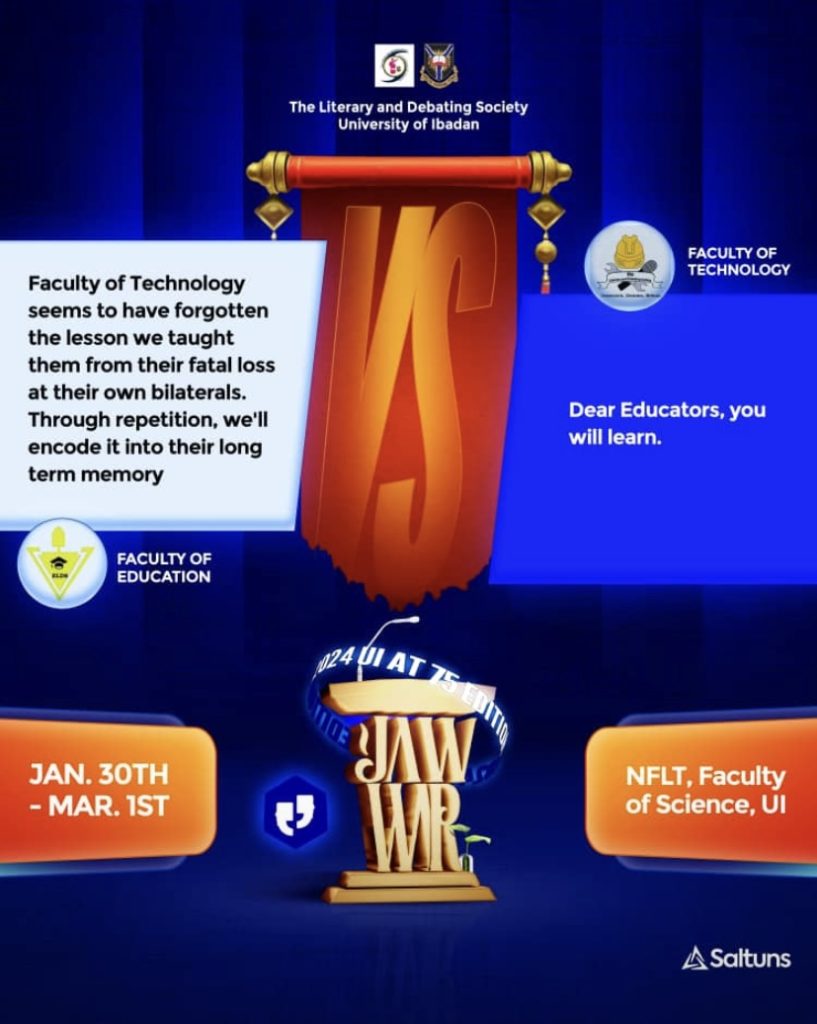 The Jaw War Preliminary Faculty Round, hosted at The Faculty of Tech’s NFLT on February 2, 2024, and kicking off at 5:20 PM, offered an engrossing experience, captivating students from the University of Ibadan and beyond. The event commenced with introductions of the speakers, Time Keeper, and Judges, followed by an explanation of the debate rules.