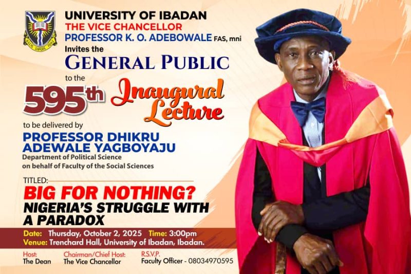 The University of Ibadan on Thursday, October 2, 2025, hosted its 595th Inaugural Lecture, delivered by Professor Dhikru Adewale Yagboyaju of the Department of Political Science, Faculty of the Social Sciences. Speaking on the theme “Big for Nothing? Nigeria’s Struggle with a Paradox”, Professor Yagboyaju emphasized that the nation’s size and abundant resources have not translated into genuine development or good governance.