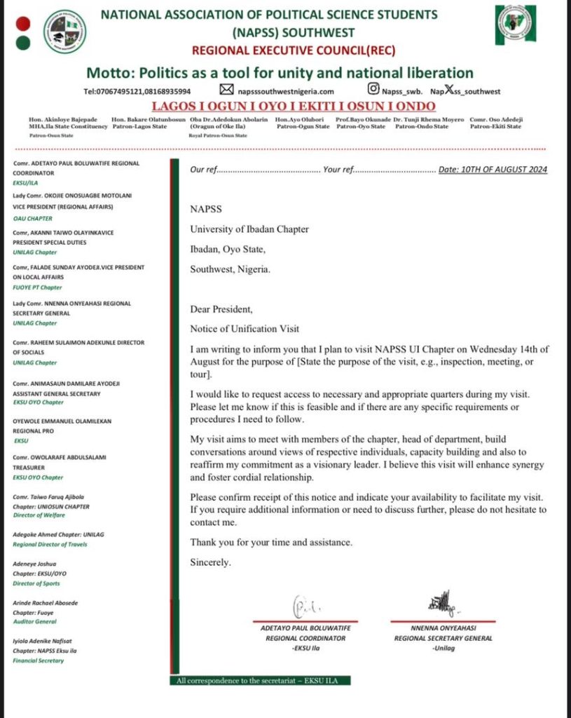 The Coordinator of National Association of Political Science Student, Southwest on Saturday 10th of August, 2024 writes to the NAPSS UI, chapter informing the Association about his visit to University of Ibadan Political Science chapter.