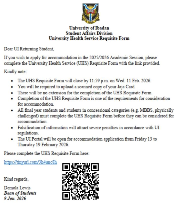 The University of Ibadan has directed returning students who intend to apply for accommodation for the 2025/2026 academic session to complete the University Health Service (UHS) Requisite Form.