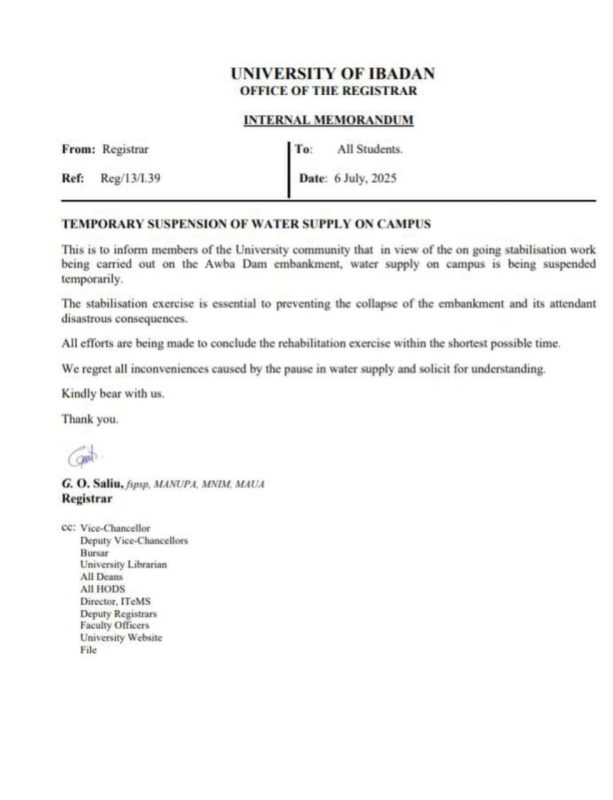 The University of Ibadan (UI) has announced a temporary suspension of water supply across its campus due to ongoing stabilisation work on the Awba Dam embankment. This was contained in an internal memorandum issued on July 6 by the Office of the Registrar, G.O. Saliu.